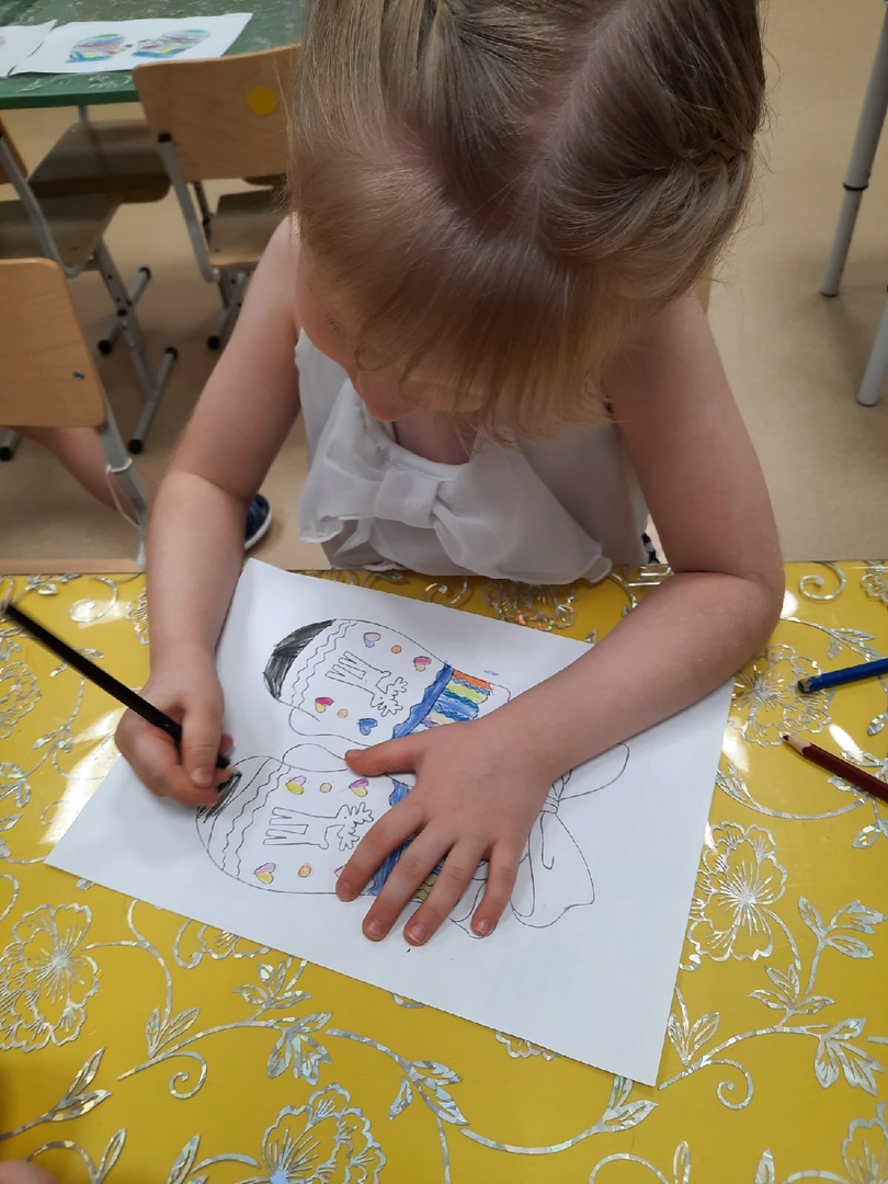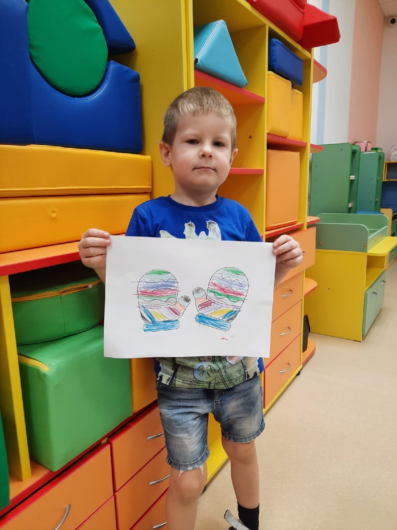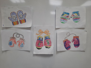 После бурного обсуждения детям было предложено сыграть в игру «Кто быстрее найдёт свои варежки» Игра сопровождалась бурей эмоций, весёлым смехом. В конце игры детям раздали листы бумаги с нераскрашенными варежками и карандашами. Дети решили, что варежки необходимо украсить. Под контролем воспитателя дети приступили к оформлению варежек.